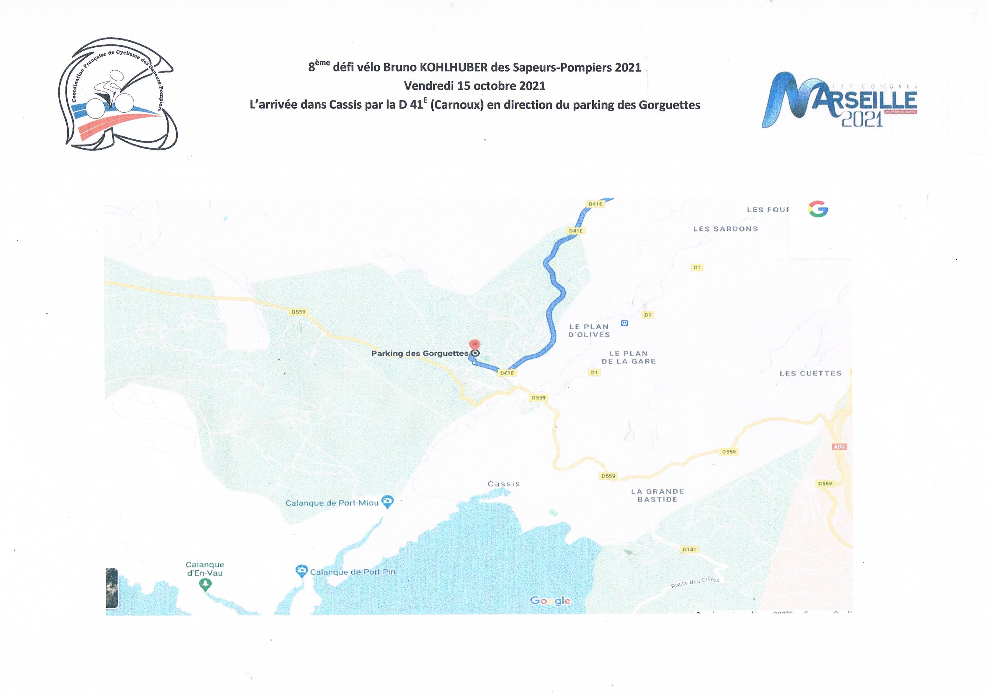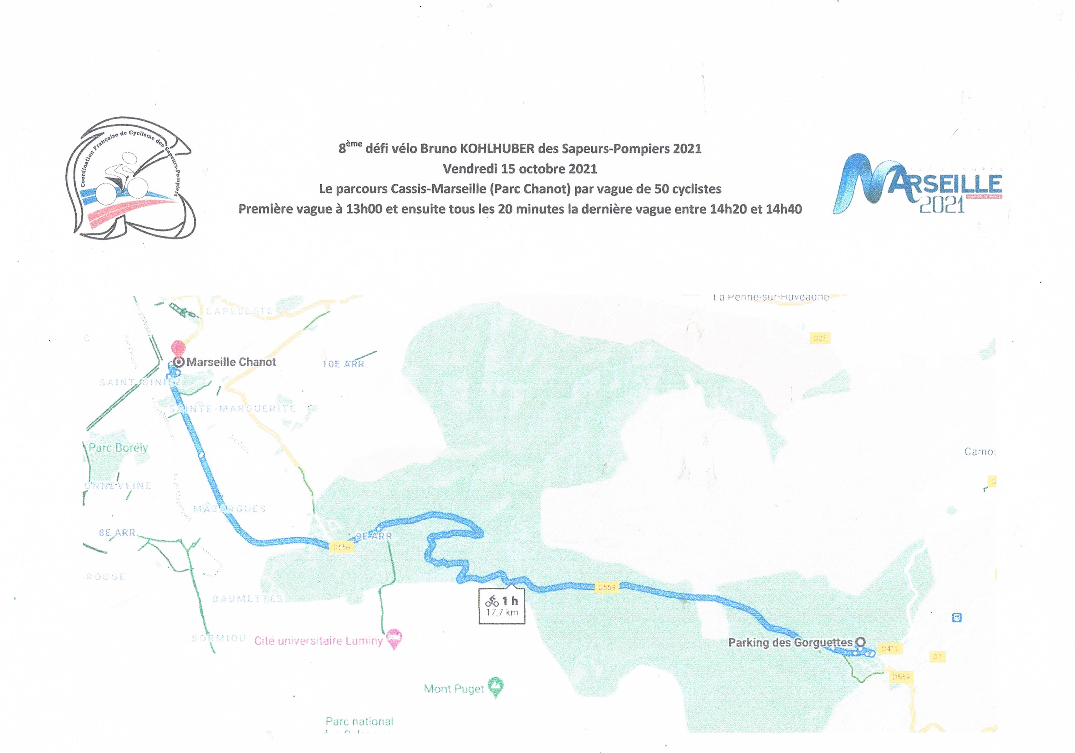 Flash info No3 sur l'arrivée Cassis-Marseille vendredi 15 octobre du 8ème défi vélo Bruno KOHLHUBER 2021Publication : mardi 22 juin 2021 11:25 | Affichages : 1468 Pièces jointes : Arrivée à Cassis Parking des Goaguettes à Cassis Plan Cassis-Marseille Arrivée Parc Chanot à Marseille Précédent Suivant